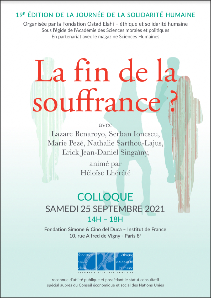 Parce qu’elle a toujours fait partie de la vie des hommes, la souffrance est une source de questionnements perpétuelle. La multiplicité de ses causes, de ses formes, des manières de la ressentir, de la juguler voire de la résoudre, continue d’alimenter la réflexion dans des champs aussi divers que la médecine, la philosophie, la psychologie, la sociologie, la religion ou encore la spiritualité. Lors de cette 19e édition de la Journée de la solidarité humaine, il ne s’agira évidemment pas d’englober tous les domaines dans lesquels la souffrance se pose en objet d’étude, mais plutôt d’explorer quelques pistes de réflexion sur la notion de « fin » de la souffrance, en ses deux acceptions – le terme et la finalité.